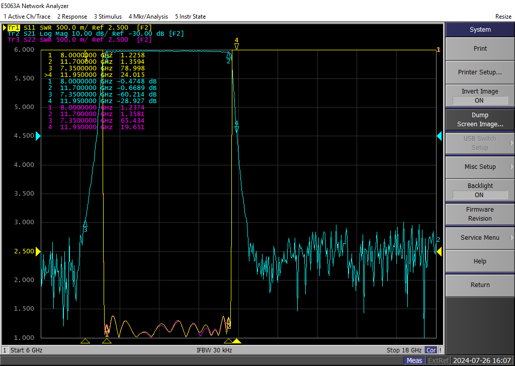 | 4 | 带外抑制 | ≥55dB@DC-7.35GHz;≥10dB@11.95-15.15GHz; ≥55dB@15.4-19.6GHz |