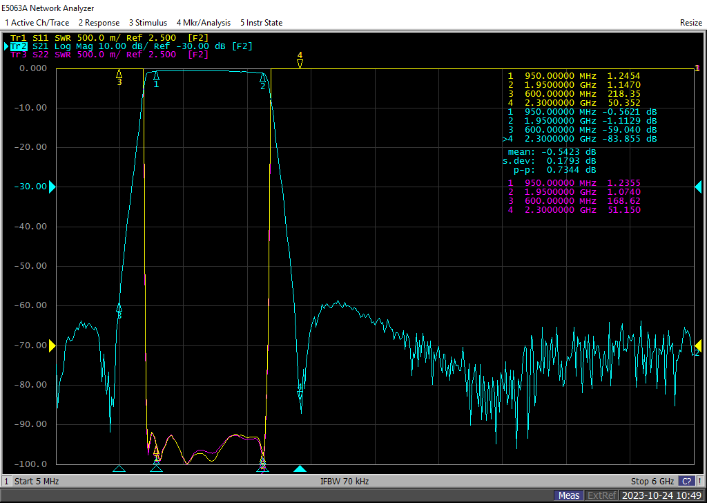 | 4 | 带外抑制 | ≥55dB@DC-0.6GHz;≥55dB@2.3-5.5GHz |